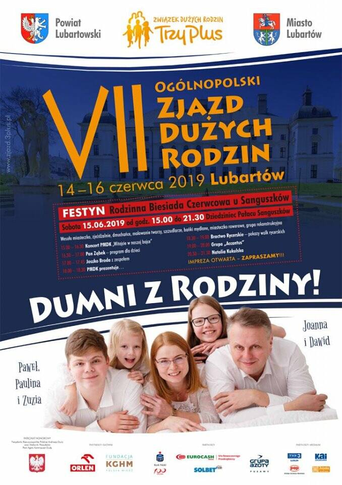 W dniach 14-16 czerwca 2019 roku Powiat Lubartowski, Miasto Lubartów oraz Związek Dużych Rodzin „Trzy Plus" będą gospodarzami VII Ogólnopolskiego Zjazdu Dużych Rodzin. Główne wydarzenia tegorocznego Zjazdu odbywać się będą w Lubartowie – mieście położonym w odległości ok. 20 km na północ od Lublina. Historia miasta sięga XVI wieku, a nazwa wiąże się z rodami jego właścicieli: Firlejów i Sanguszków.