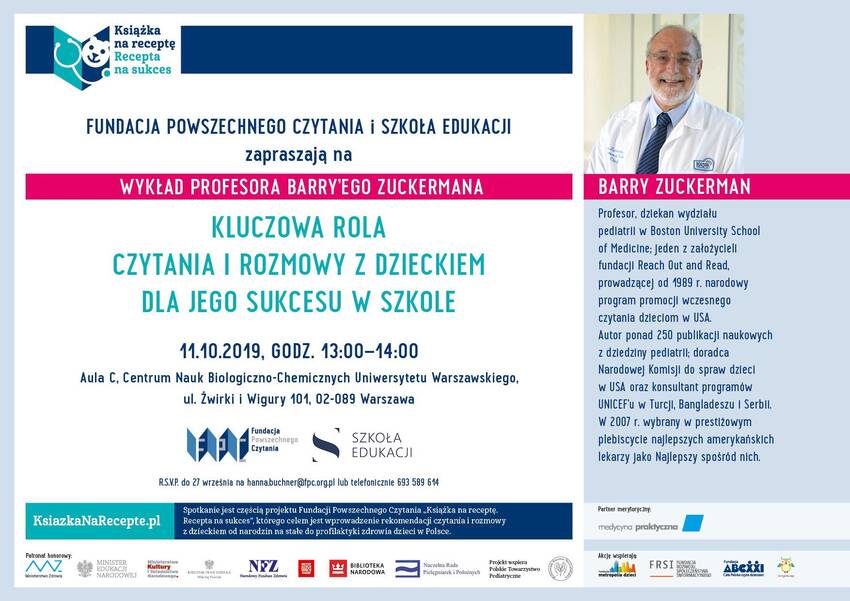 W zeszłym tygodniu, 11 października 2019 r. w Centrum Nauk Biologiczno-Chemicznych Uniwersytetu Warszawskiego, Związek Dużych Rodzin 3 Plus miał okazję wysłuchać wykładu prof. pediatrii Barry’ego Zuckermana na temat kluczowej roli czytania i rozmowy z dzieckiem dla jego sukcesu w szkole.