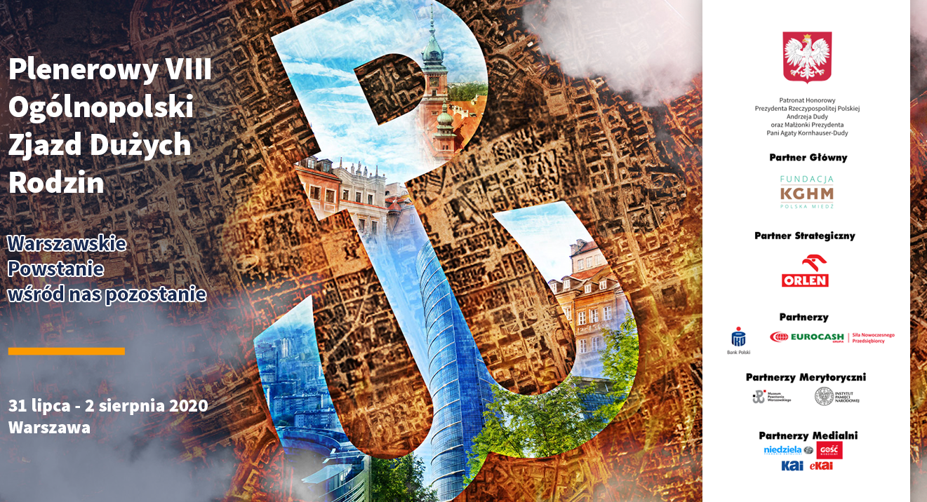 Jeszcze dwa miesiące temu nikomu nie przyszłoby do głowy organizowanie tradycyjnego, corocznego Zjazdu Dużych Rodzin. Już niemal pogodziliśmy się z myślą, że skoro nawet kalendarz światowych rozgrywek piłkarskich został zaburzony, to i nam nie pozostaje nic innego. Wystarczyło jednak, że pojawił się promyk nadziei po złagodzeniu obostrzeń sanitarnych, a nasz sztab organizacyjny przystąpił do działań. Wybrano najpierw termin (nieprzypadkowo!) czyli dni 31 lipca – 2 sierpnia 2020 i miejsce: Warszawę. Dzięki temu mogliśmy też włączyć się w obchody 76. rocznicy Powstania Warszawskiego, oddać hołd bohaterom tamtych dni i pokazać naszym dzieciom, czym jest patriotyzm oraz poświęcenie dla Ojczyzny.