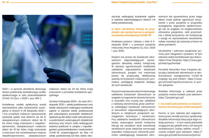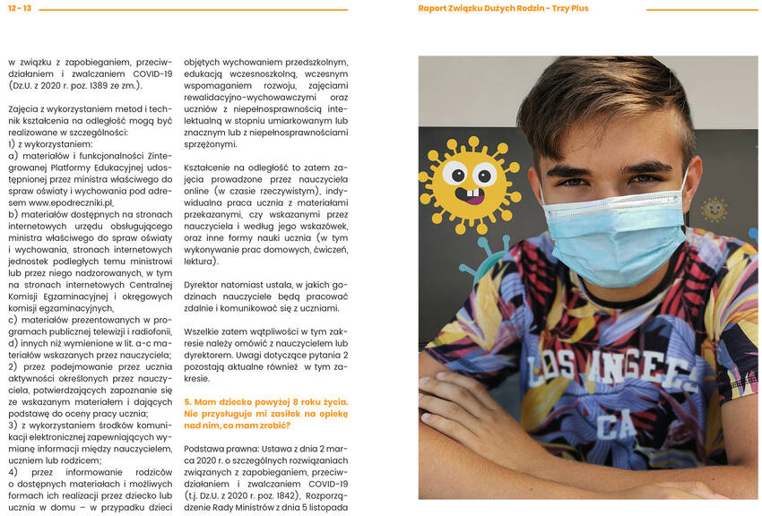 na uwadze troskę i dbając o dobro naszych rodzin, przygotowaliśmy poradnik dotyczący prawnych uwarunkowań związanych z pandemią. Zebrane w nim zagadnienia są odpowiedzią na zgłaszane przez Was problemy w ankiecie przeprowadzonej przez Związek Dużych Rodzin 3 Plus w październiku 2020 roku i dotyczącej sytuacji pandemicznej w Polsce.